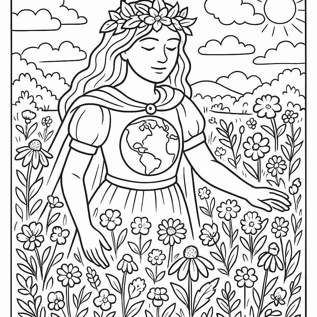 A detailed coloring page featuring earth guardian protecting endangered wildflower meadow. Perfect for tweens (9-12) with intricate detail for a fun coloring experience.
