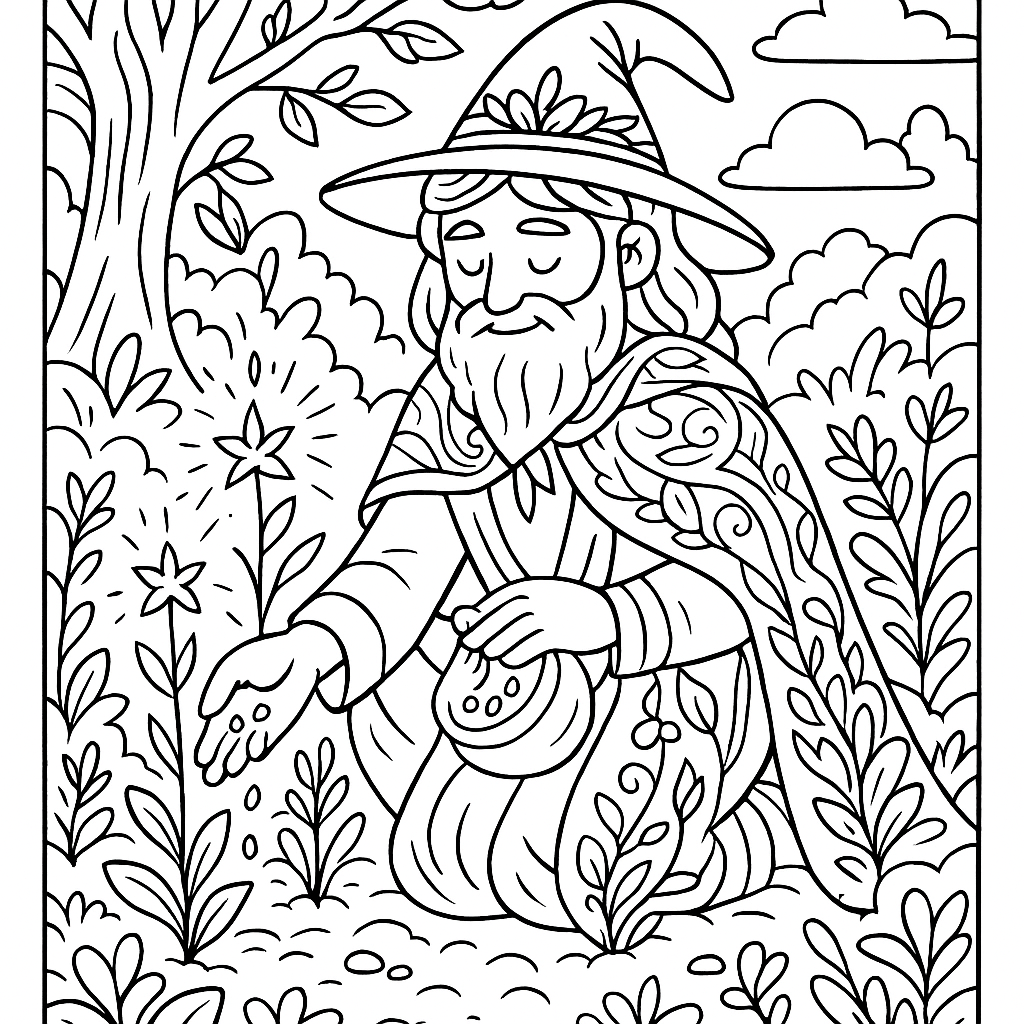 A detailed coloring page featuring nature guardian planting magical seeds that sprout instantly. Perfect for kids (6-9) with intricate detail for a fun coloring experience.