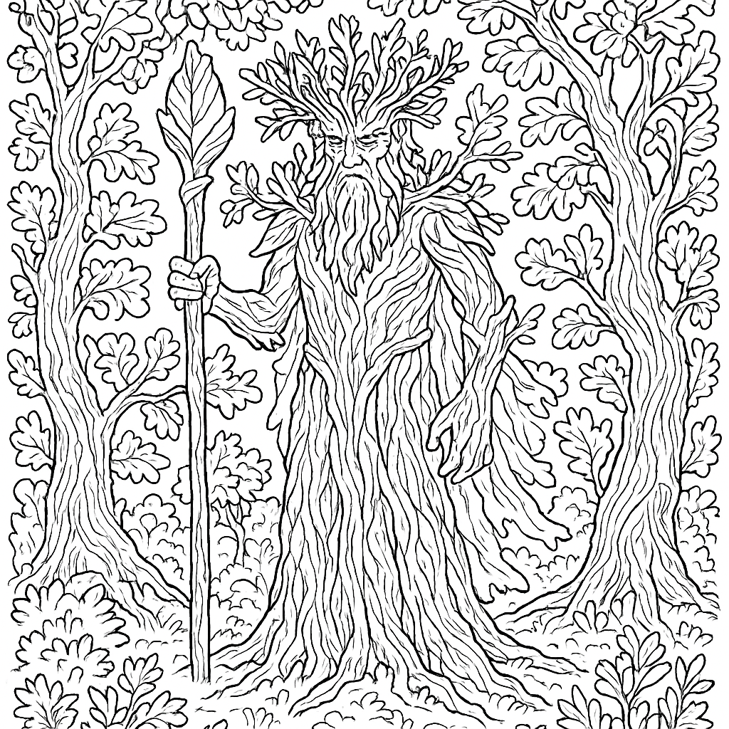 A detailed coloring page featuring tree spirit guardian protecting a grove of ancient oaks. Perfect for tweens (9-12) with intricate detail for a fun coloring experience.