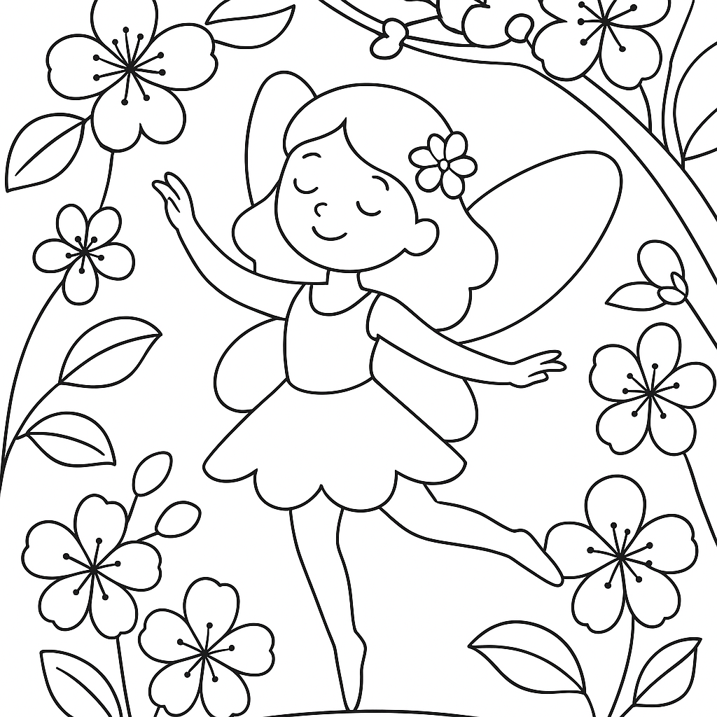 A simple coloring page featuring a garden fairy dancing among cherry blossoms. Perfect for kids (4-6) with large, bold outlines for a fun coloring experience.