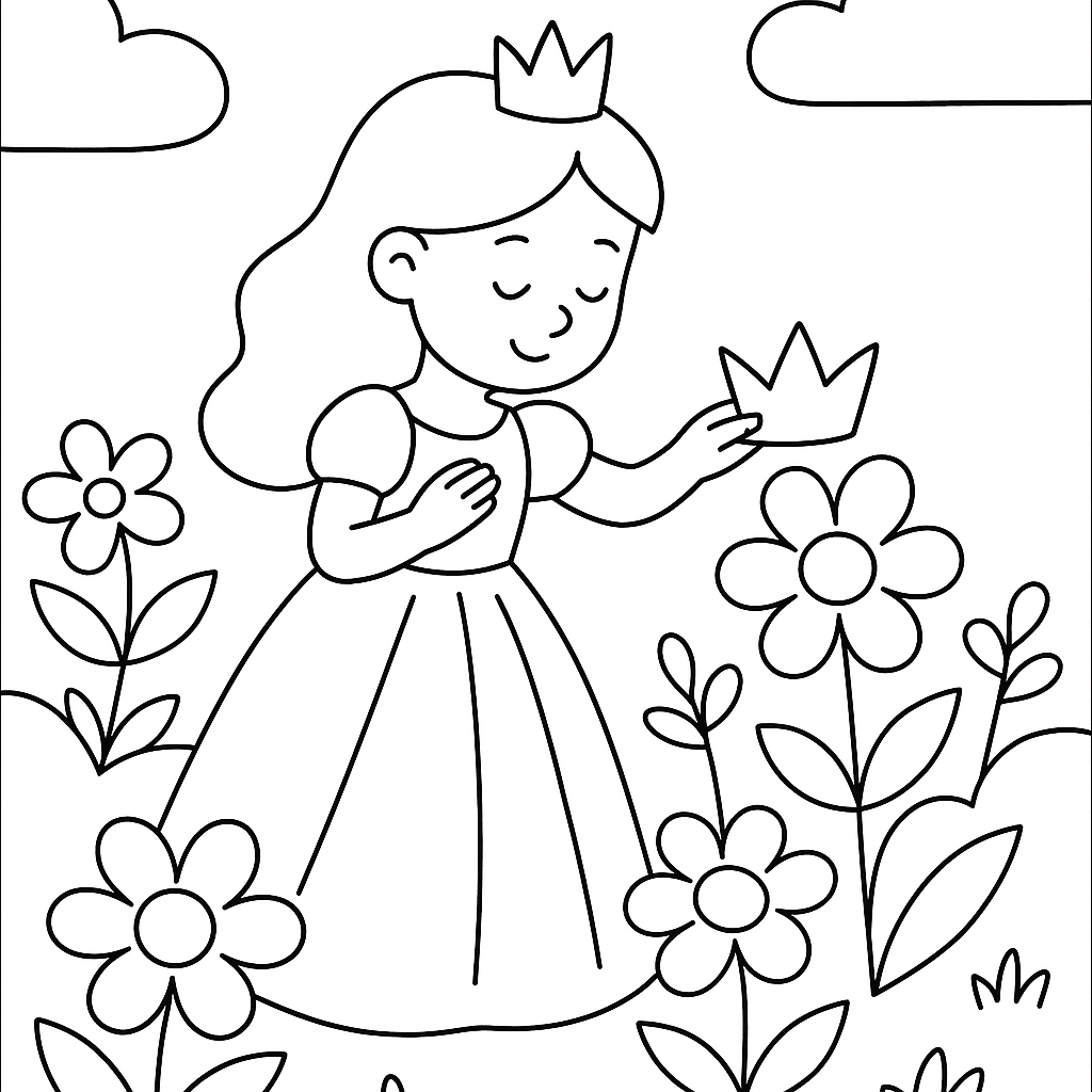 A simple coloring page featuring a garden princess crowning flowers as they bloom. Perfect for kids (4-6) with large, bold outlines for a fun coloring experience.
