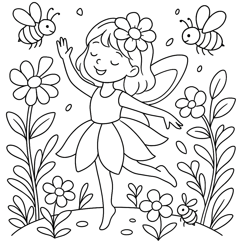 A medium coloring page featuring flower fairy dancing in garden with bee friends. Perfect for kids (6-9) with moderately detailed outlines for a fun coloring experience.