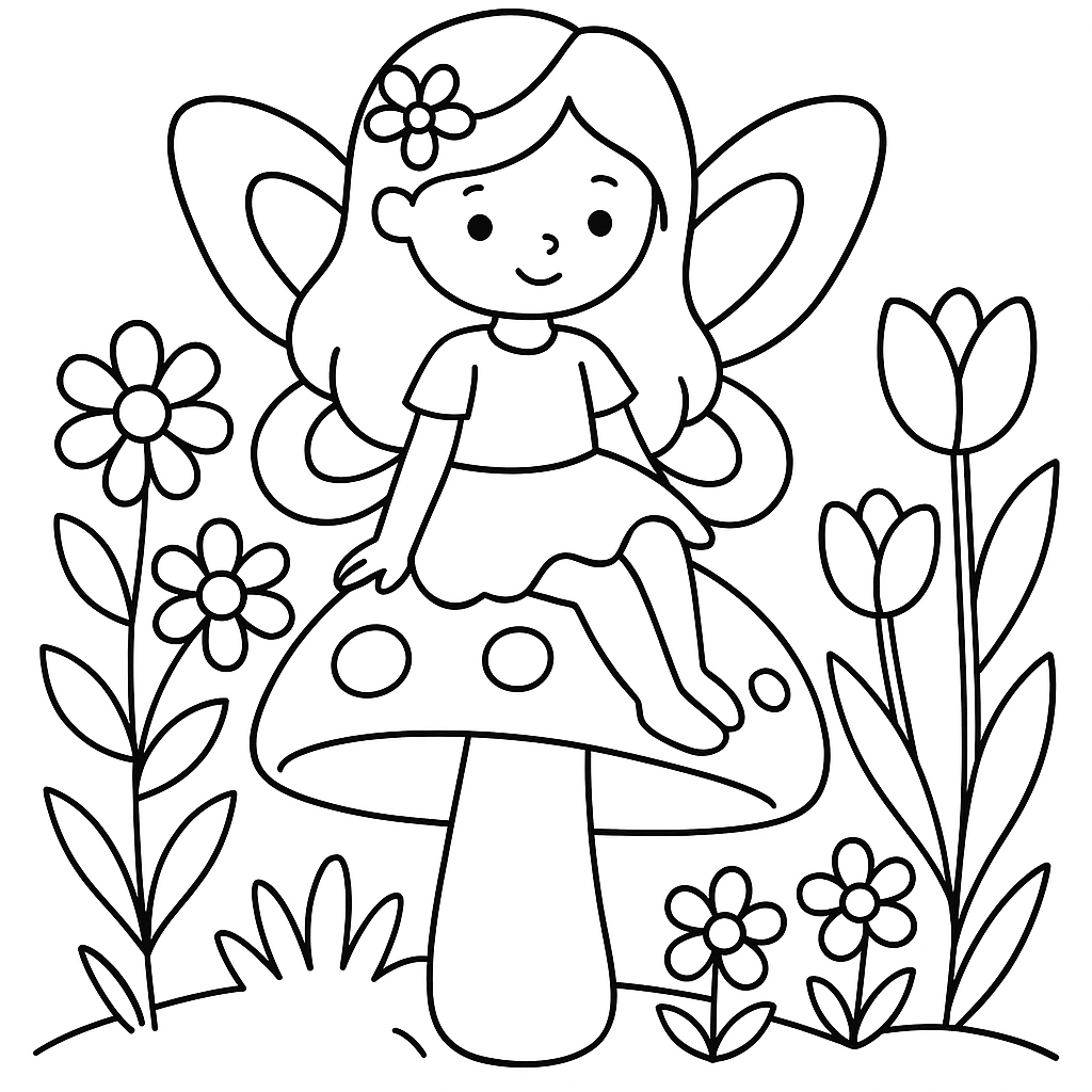 A simple coloring page featuring garden fairy sitting on a mushroom surrounded by spring flowers. Perfect for kids (4-6) with large, bold outlines for a fun coloring experience.