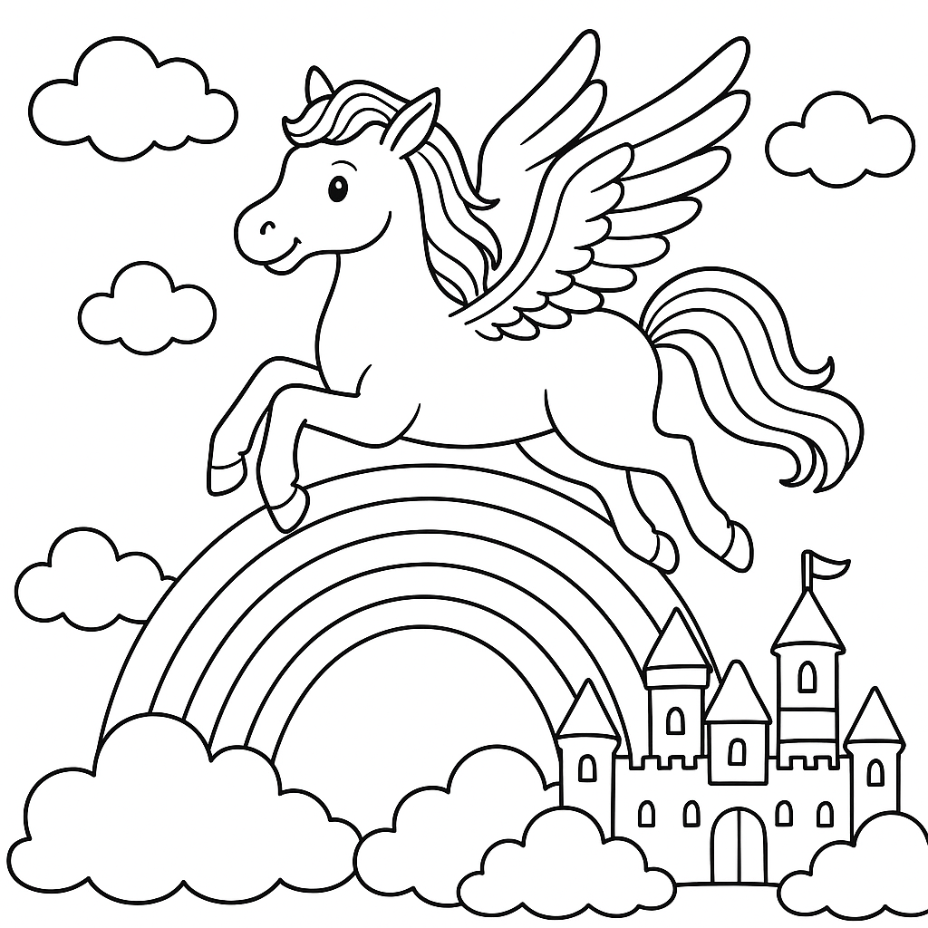 A medium coloring page featuring pegasus soaring over rainbow and cloud castle. Perfect for kids (6-9) with moderately detailed outlines for a fun coloring experience.