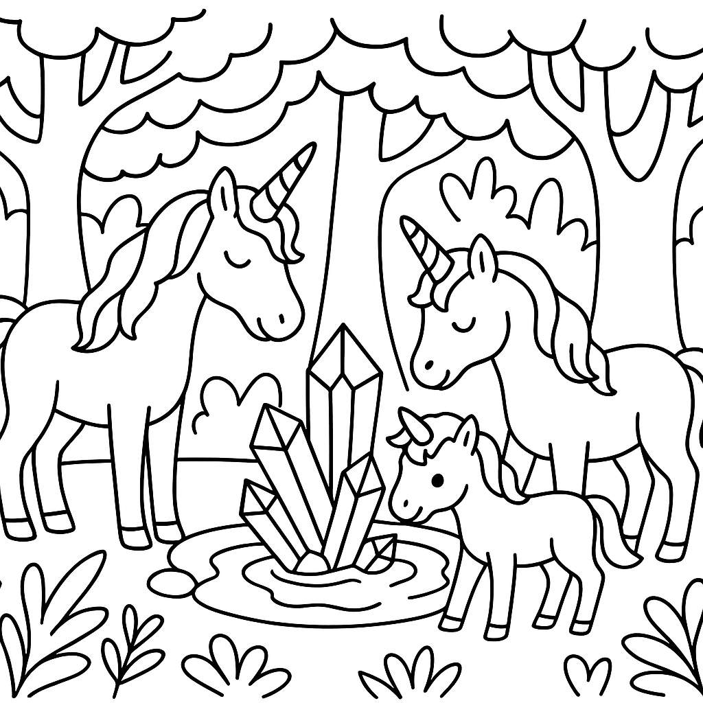 A simple coloring page featuring unicorn family drinking from crystal spring in enchanted forest. Perfect for kids (4-6) with large, bold outlines for a fun coloring experience.
