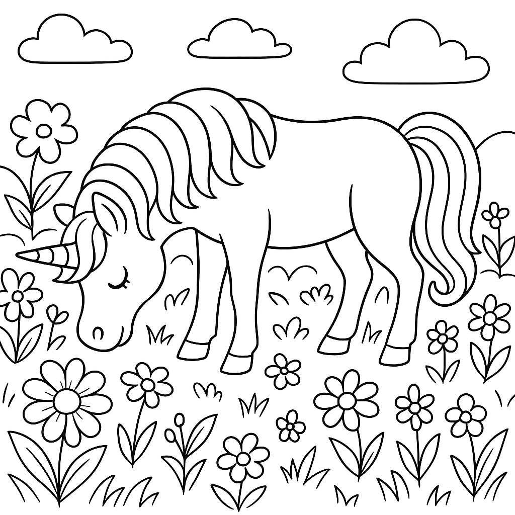 A medium coloring page featuring unicorn grazing in meadow of spring flowers. Perfect for kids (6-9) with moderately detailed outlines for a fun coloring experience.