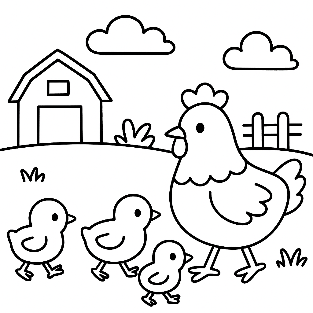 A simple coloring page featuring baby chicks following mother hen in farmyard. Perfect for toddlers (2-4) with large, bold outlines for a fun coloring experience.