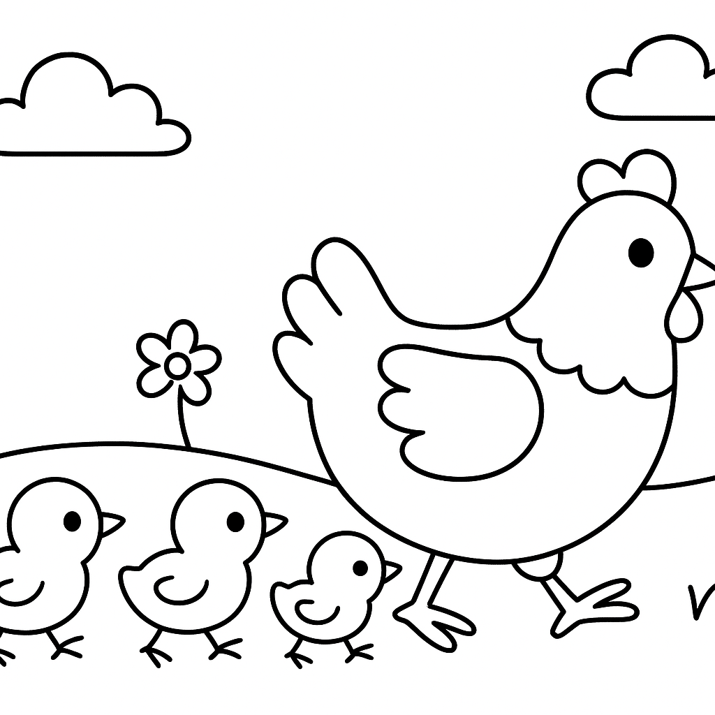 A simple coloring page featuring baby chicks following their mother hen. Perfect for toddlers (2-4) with large, bold outlines for a fun coloring experience.