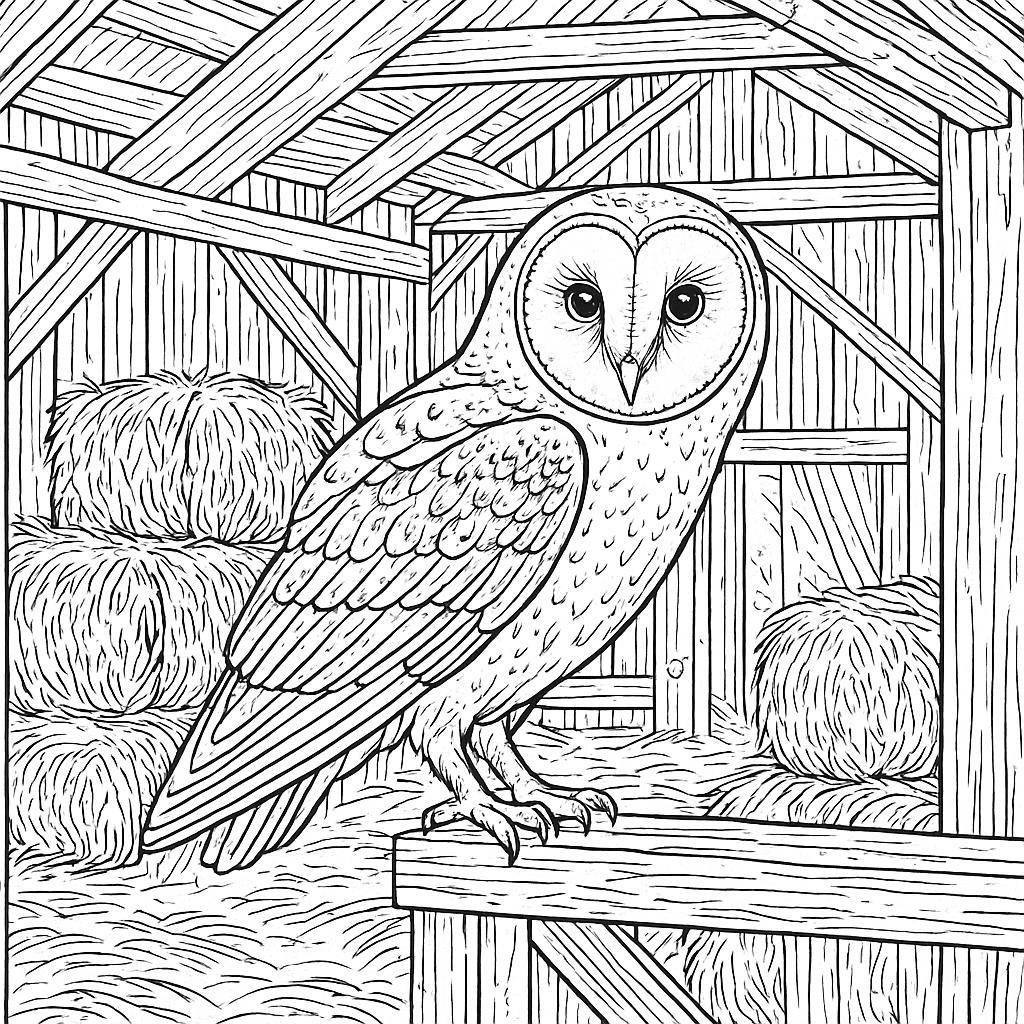 A detailed coloring page featuring barn owl perched in old barn with hay bales. Perfect for tweens (9-12) with intricate detail for a fun coloring experience.
