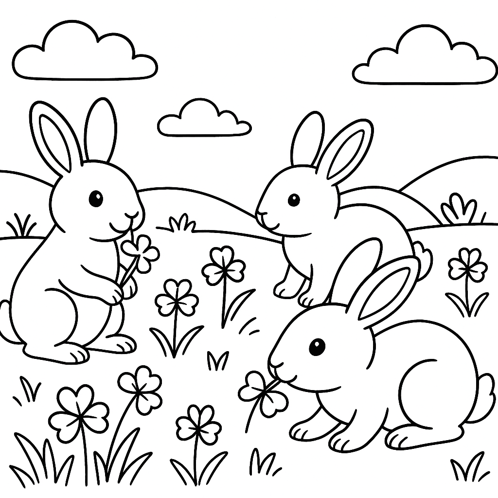 A simple coloring page featuring wild rabbits eating clover in countryside meadow. Perfect for kids (4-6) with large, bold outlines for a fun coloring experience.