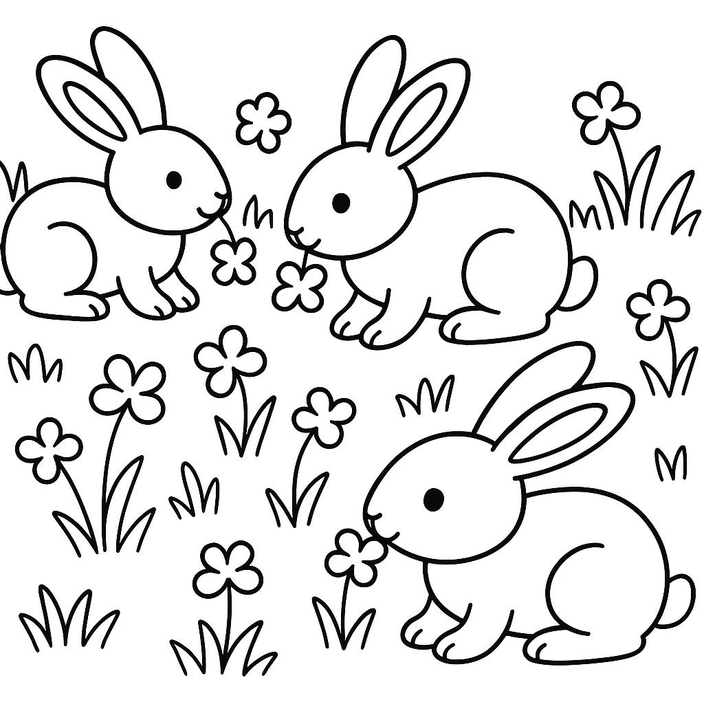 A simple coloring page featuring wild rabbits eating clover in meadow. Perfect for toddlers (2-4) with large, bold outlines for a fun coloring experience.