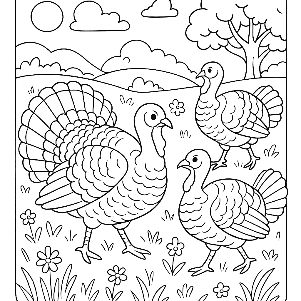 A medium coloring page featuring wild turkeys strutting through a country meadow in spring. Perfect for kids (6-9) with moderately detailed outlines for a fun coloring experience.