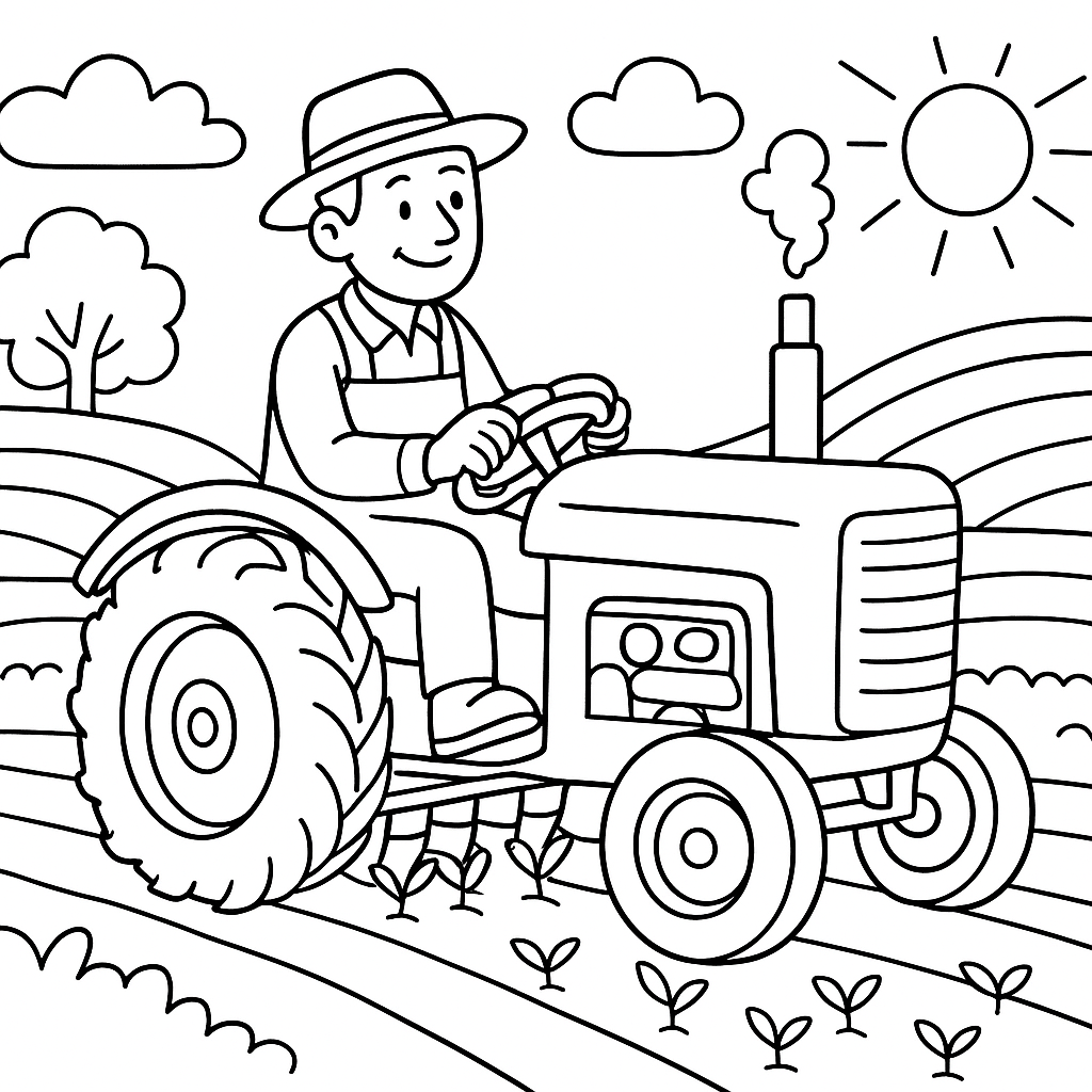 A medium coloring page featuring a farmer driving a tractor while planting crops in spring fields. Perfect for kids (6-9) with moderately detailed outlines for a fun coloring experience.