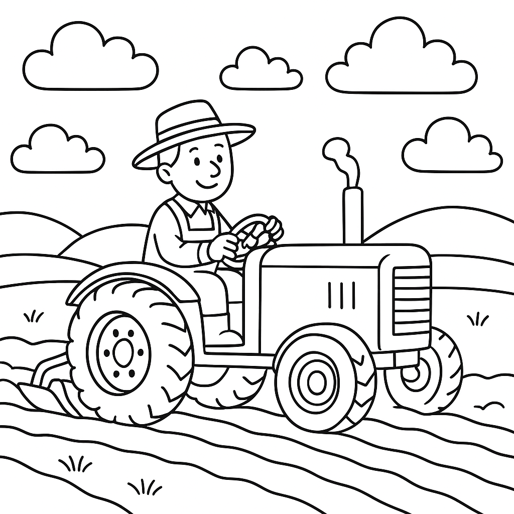 A medium coloring page featuring a farmer on a tractor plowing fields with spring clouds overhead. Perfect for kids (6-9) with moderately detailed outlines for a fun coloring experience.