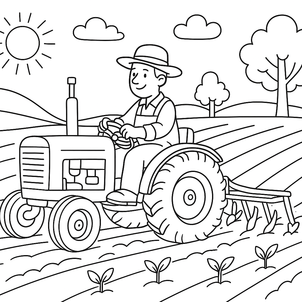 A medium coloring page featuring farmer on tractor planting crops in spring fields. Perfect for kids (6-9) with moderately detailed outlines for a fun coloring experience.