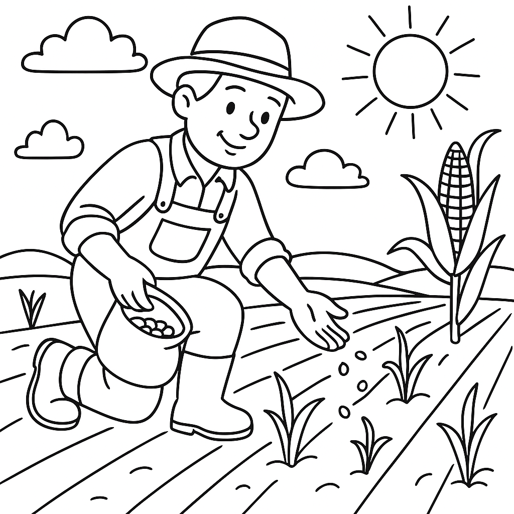 A medium coloring page featuring farmer planting corn seeds in spring fields. Perfect for kids (6-9) with moderately detailed outlines for a fun coloring experience.