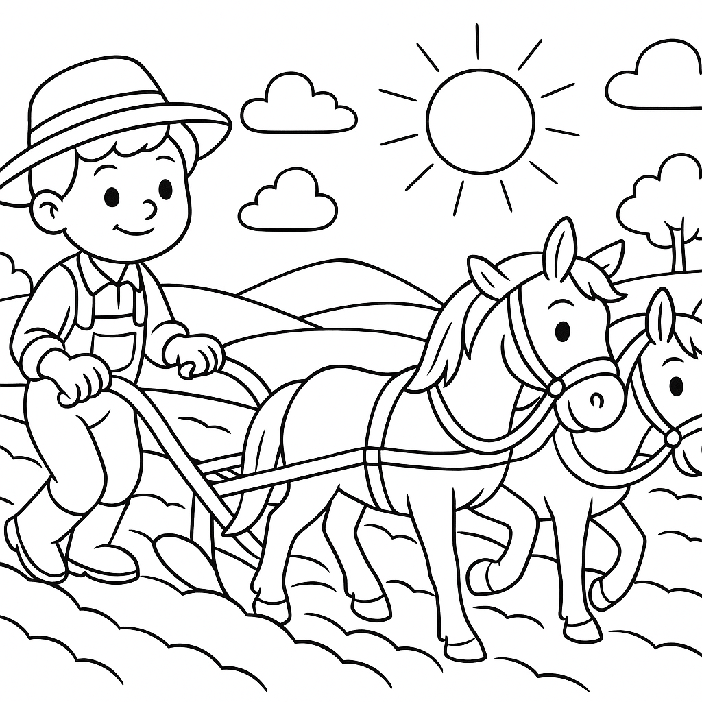 A medium coloring page featuring farmer plowing field for spring planting. Perfect for kids (6-9) with moderately detailed outlines for a fun coloring experience.