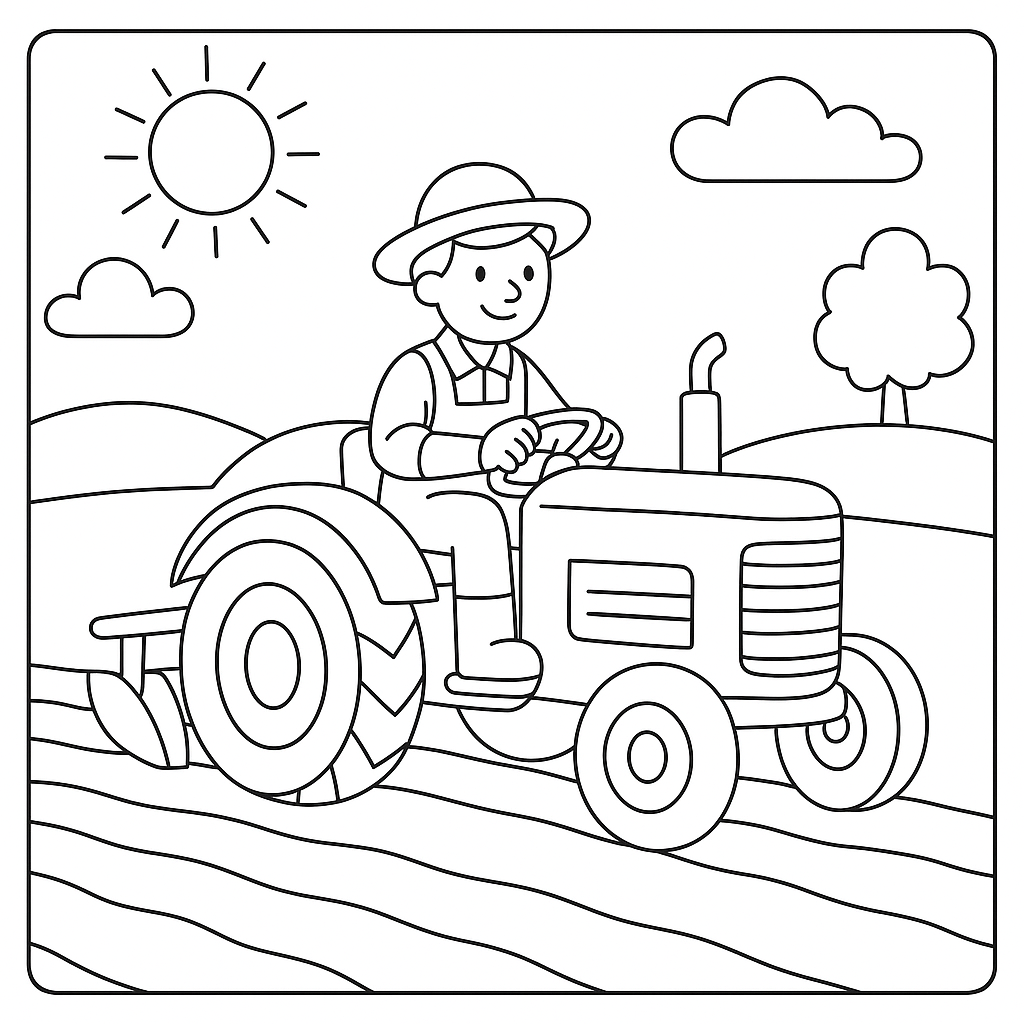 A simple coloring page featuring farmer preparing fields with tractor for spring planting. Perfect for kids (4-6) with large, bold outlines for a fun coloring experience.