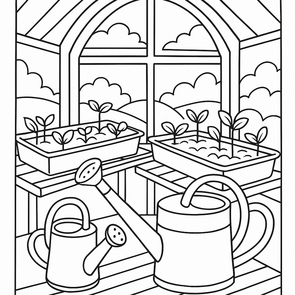 A medium coloring page featuring a greenhouse filled with seedling trays and watering cans. Perfect for kids (6-9) with moderately detailed outlines for a fun coloring experience.
