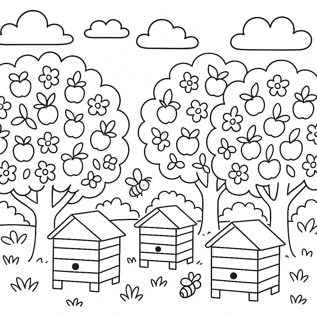 A medium coloring page featuring apple orchard in bloom with beehives nearby. Perfect for kids (6-9) with moderately detailed outlines for a fun coloring experience.