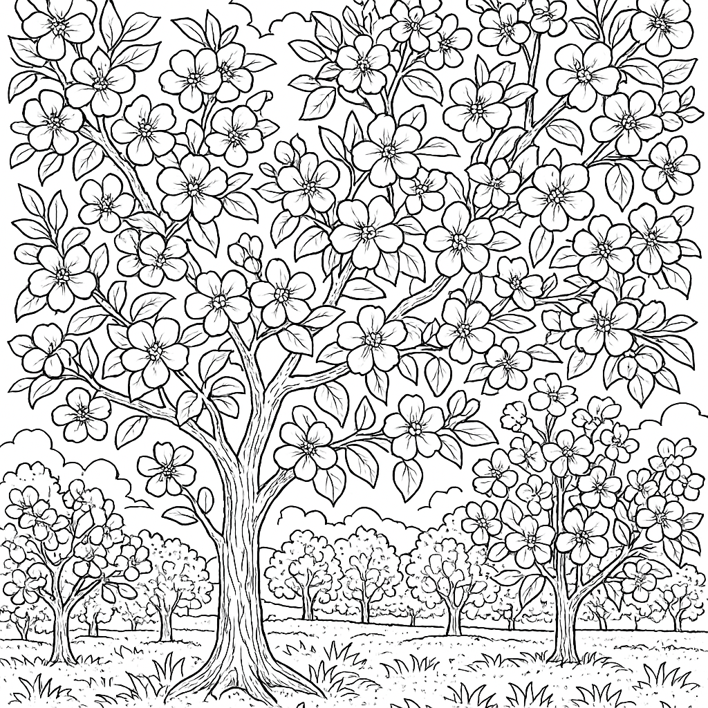 A detailed coloring page featuring apple orchard in bloom with white and pink blossoms. Perfect for tweens (9-12) with intricate detail for a fun coloring experience.
