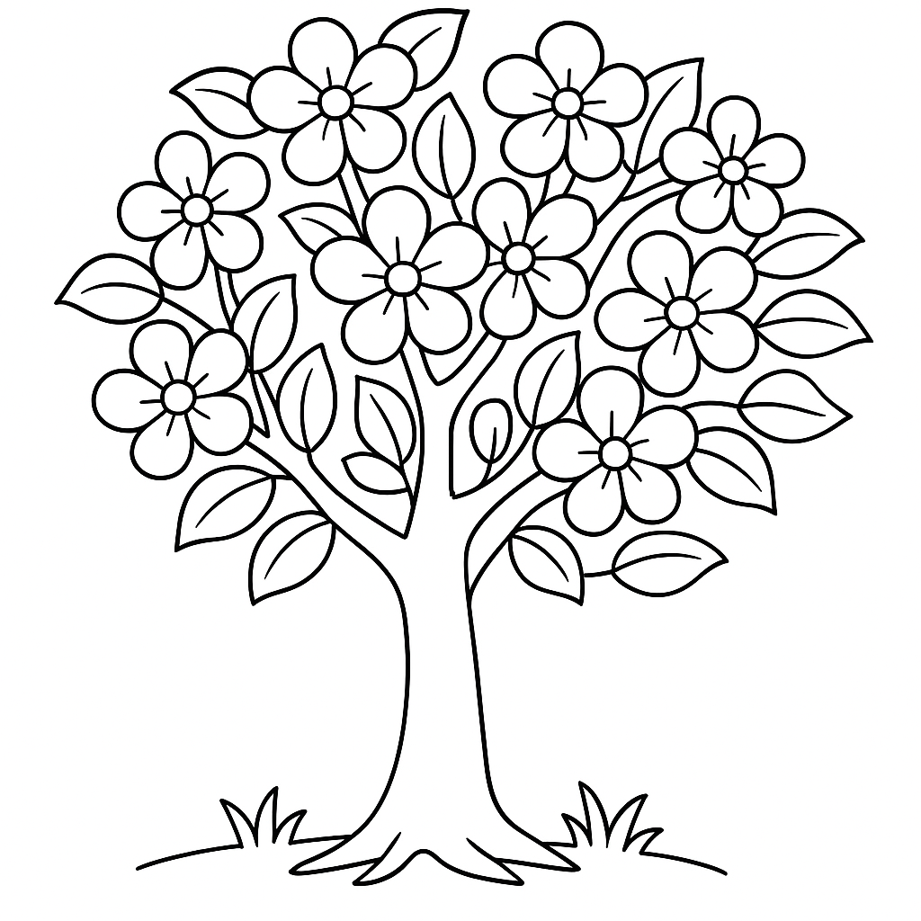 A simple coloring page featuring apple tree blossoming with pink flowers. Perfect for kids (4-6) with large, bold outlines for a fun coloring experience.