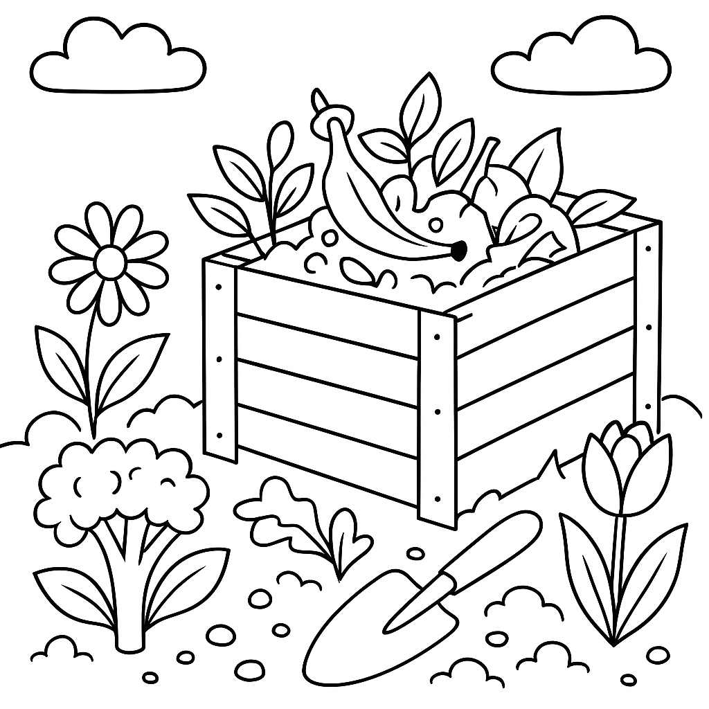 A medium coloring page featuring composting system with spring garden scraps. Perfect for kids (6-9) with moderately detailed outlines for a fun coloring experience.