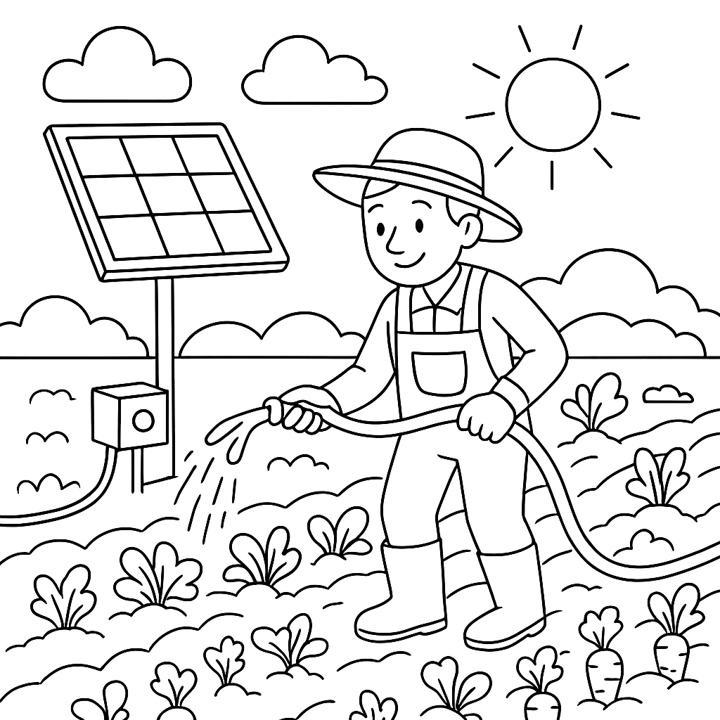 A medium coloring page featuring farmer using solar-powered equipment in vegetable fields. Perfect for kids (6-9) with moderately detailed outlines for a fun coloring experience.