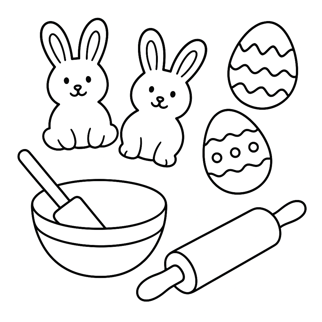 A simple coloring page featuring baking Easter cookies shaped like bunnies and eggs. Perfect for kids (4-6) with large, bold outlines for a fun coloring experience.