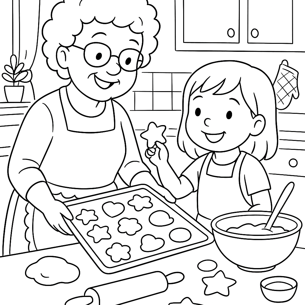 A medium coloring page featuring grandmother and child baking Easter cookies. Perfect for kids (4-6) with moderately detailed outlines for a fun coloring experience.