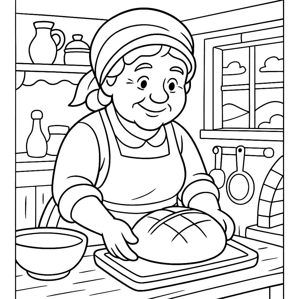 A medium coloring page featuring grandmother baking fresh bread in country kitchen. Perfect for kids (6-9) with moderately detailed outlines for a fun coloring experience.