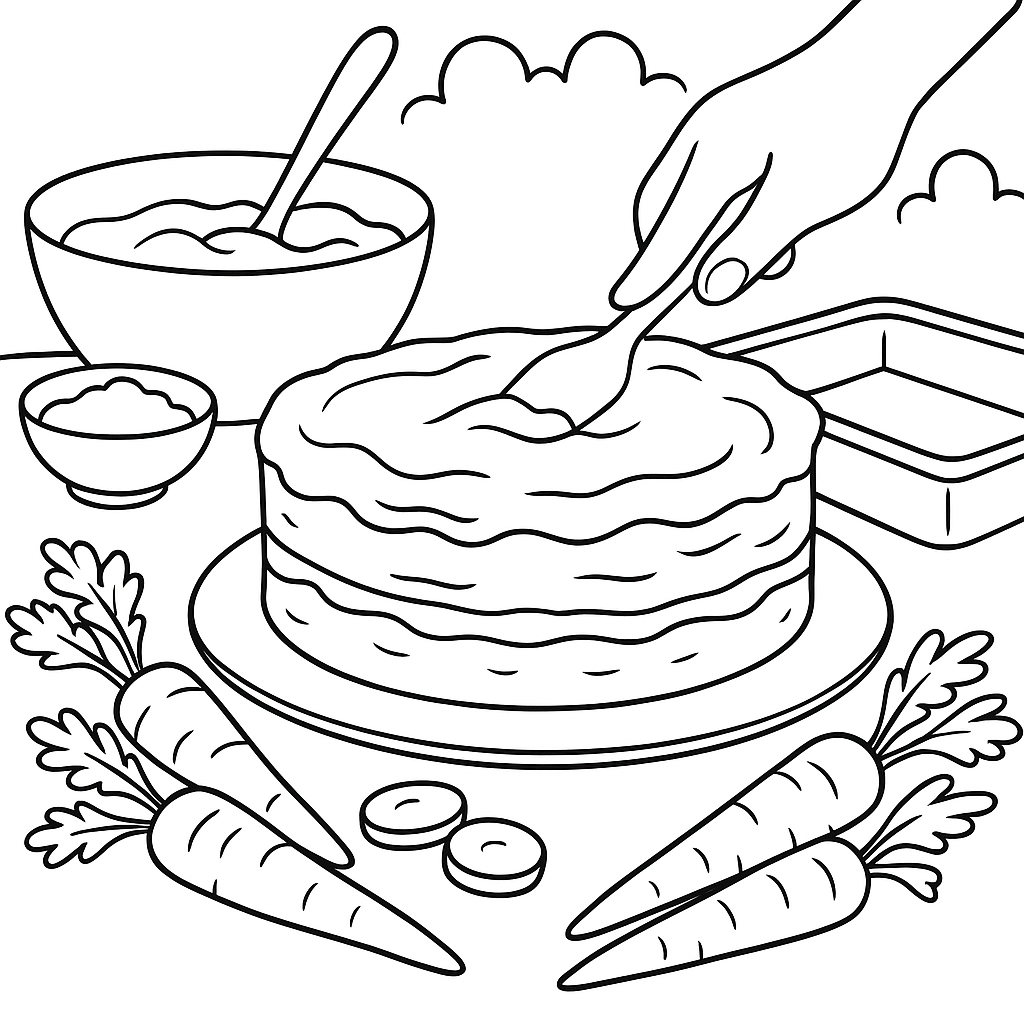 A medium coloring page featuring making carrot cake with fresh spring carrots. Perfect for kids (6-9) with moderately detailed outlines for a fun coloring experience.