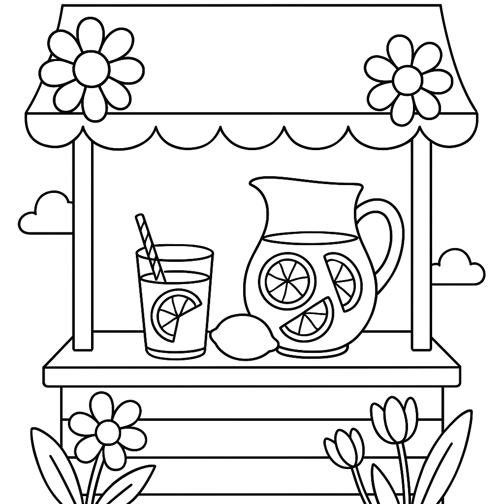 A simple coloring page featuring fresh lemonade stand with spring flowers decoration. Perfect for kids (4-6) with large, bold outlines for a fun coloring experience.