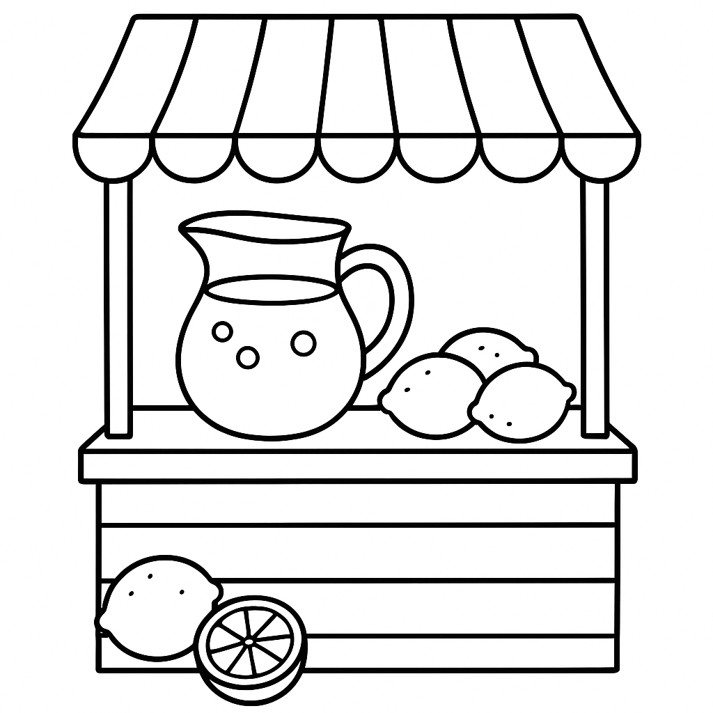 A simple coloring page featuring lemonade stand with pitcher and fresh lemons. Perfect for kids (4-6) with large, bold outlines for a fun coloring experience.