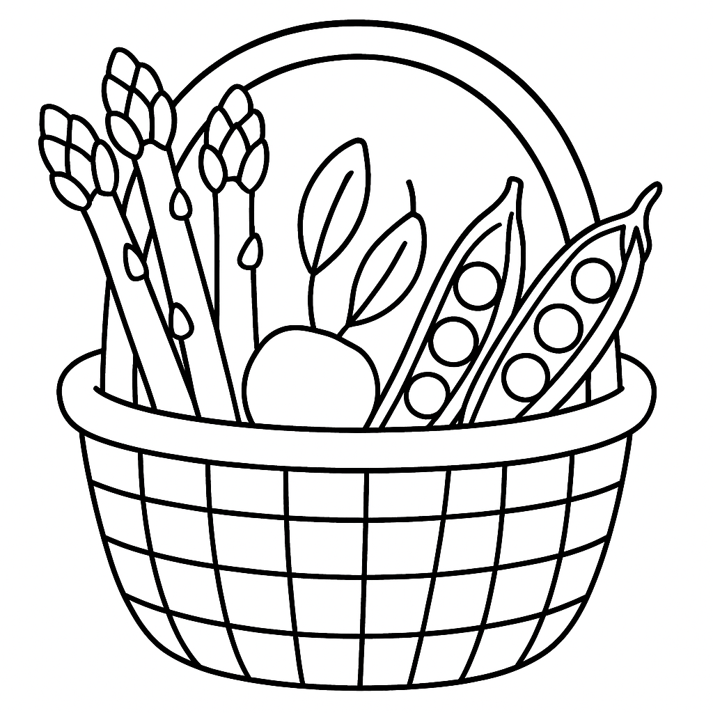A simple coloring page featuring a basket filled with fresh spring vegetables like asparagus and peas. Perfect for kids (4-6) with large, bold outlines for a fun coloring experience.