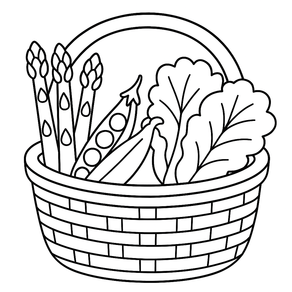 A simple coloring page featuring a basket of spring vegetables like asparagus, peas, and lettuce. Perfect for kids (4-6) with large, bold outlines for a fun coloring experience.