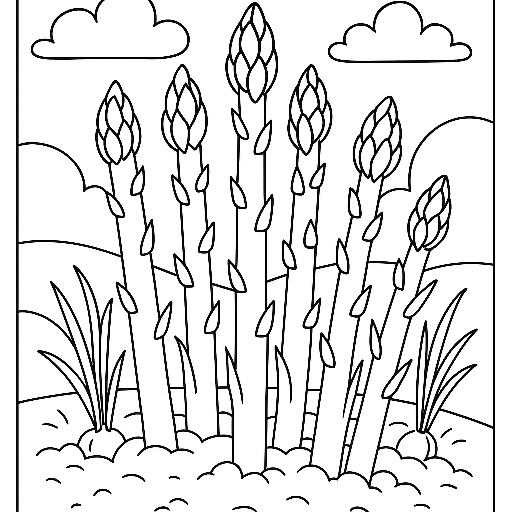 A medium coloring page featuring asparagus spears growing in garden bed. Perfect for kids (6-9) with moderately detailed outlines for a fun coloring experience.