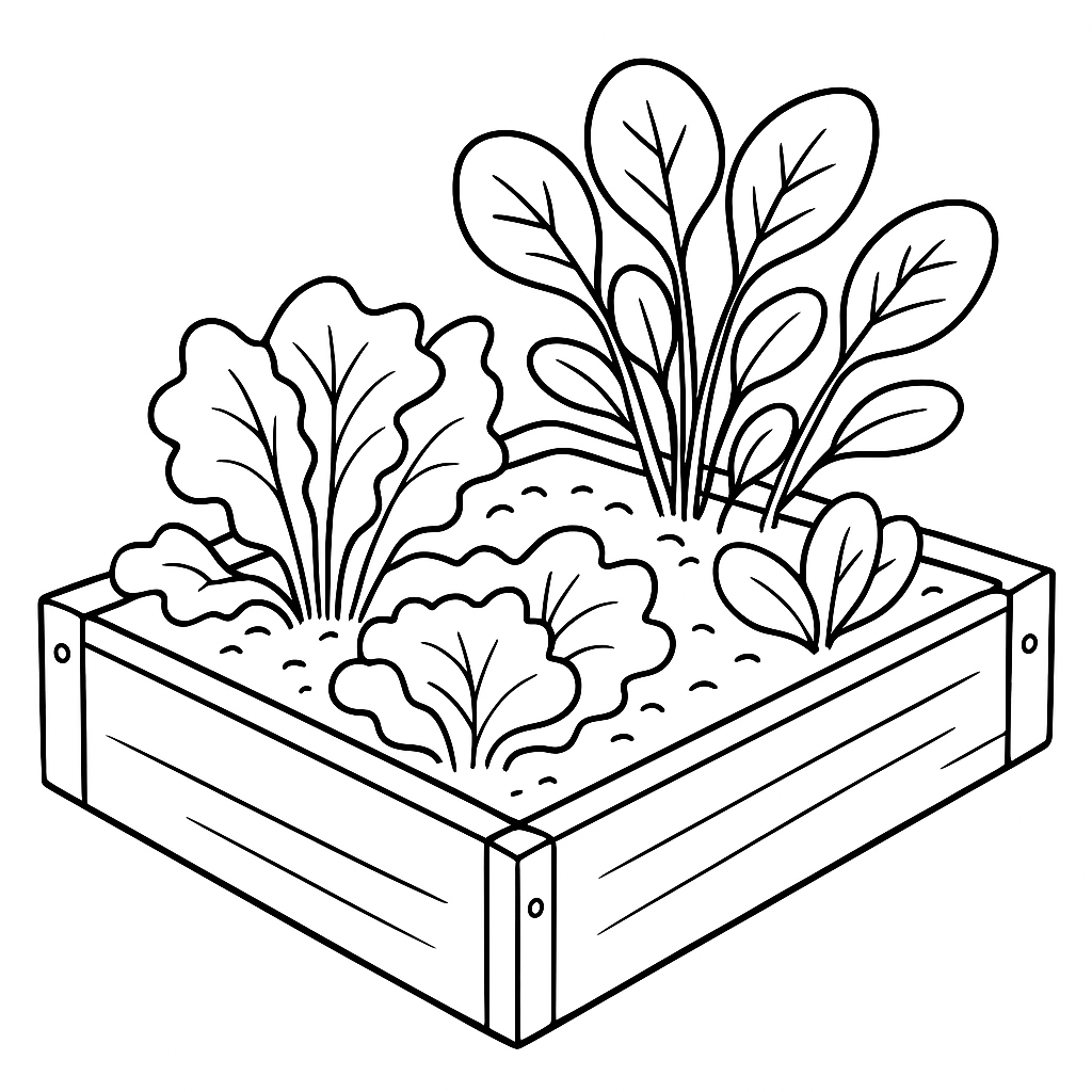 A medium coloring page featuring lettuce and spinach growing in raised bed. Perfect for kids (6-9) with moderately detailed outlines for a fun coloring experience.