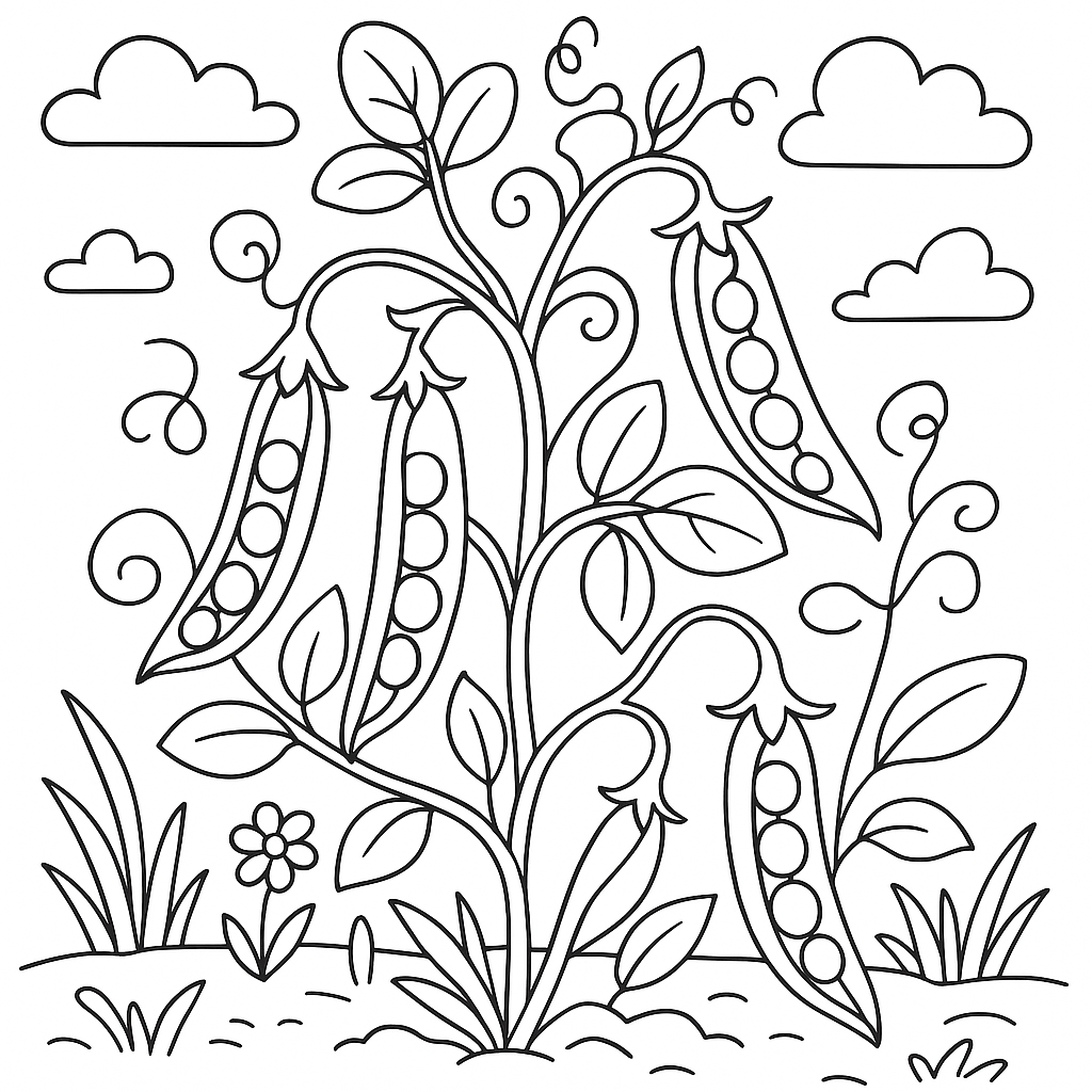 A medium coloring page featuring peas growing on vines in spring garden. Perfect for kids (6-9) with moderately detailed outlines for a fun coloring experience.