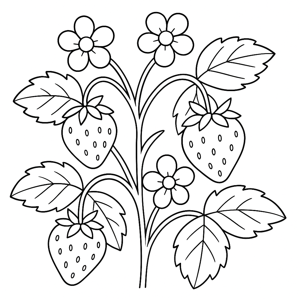 A simple coloring page featuring strawberry plants with flowers and ripe berries. Perfect for kids (4-6) with large, bold outlines for a fun coloring experience.