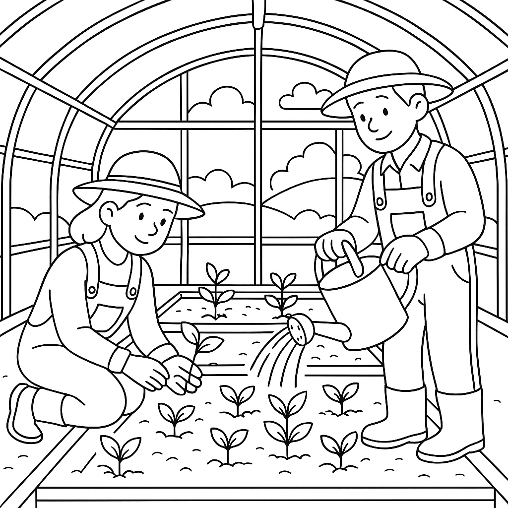 A medium coloring page featuring a greenhouse with organic seedlings being tended by farmers. Perfect for kids (6-9) with moderately detailed outlines for a fun coloring experience.