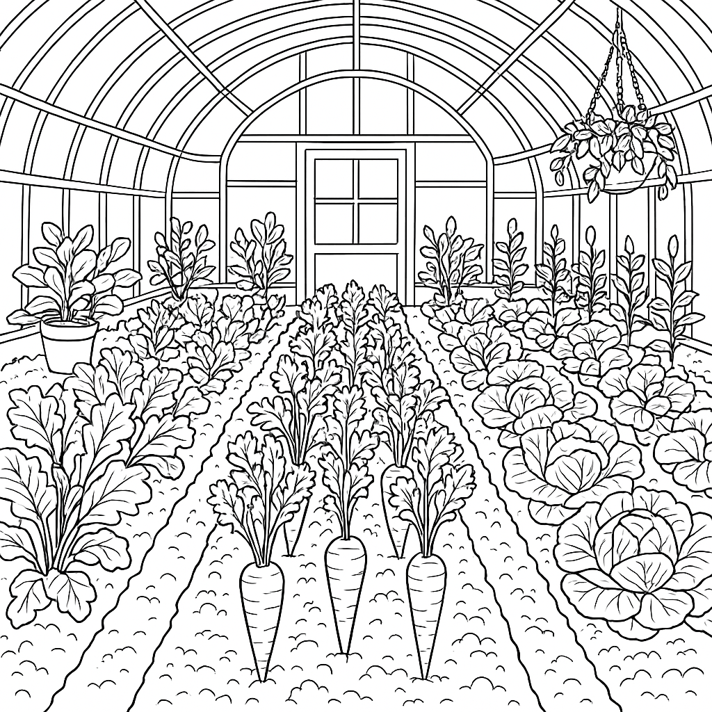 A detailed coloring page featuring greenhouse with rows of spring vegetables growing. Perfect for tweens (9-12) with intricate detail for a fun coloring experience.