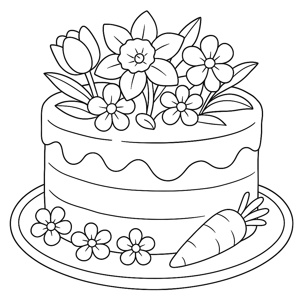 A medium coloring page featuring carrot cake decorated with marzipan spring flowers. Perfect for kids (6-9) with moderately detailed outlines for a fun coloring experience.