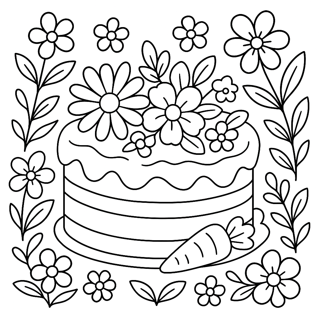 A medium coloring page featuring carrot cake decorated with spring flowers. Perfect for kids (6-9) with moderately detailed outlines for a fun coloring experience.