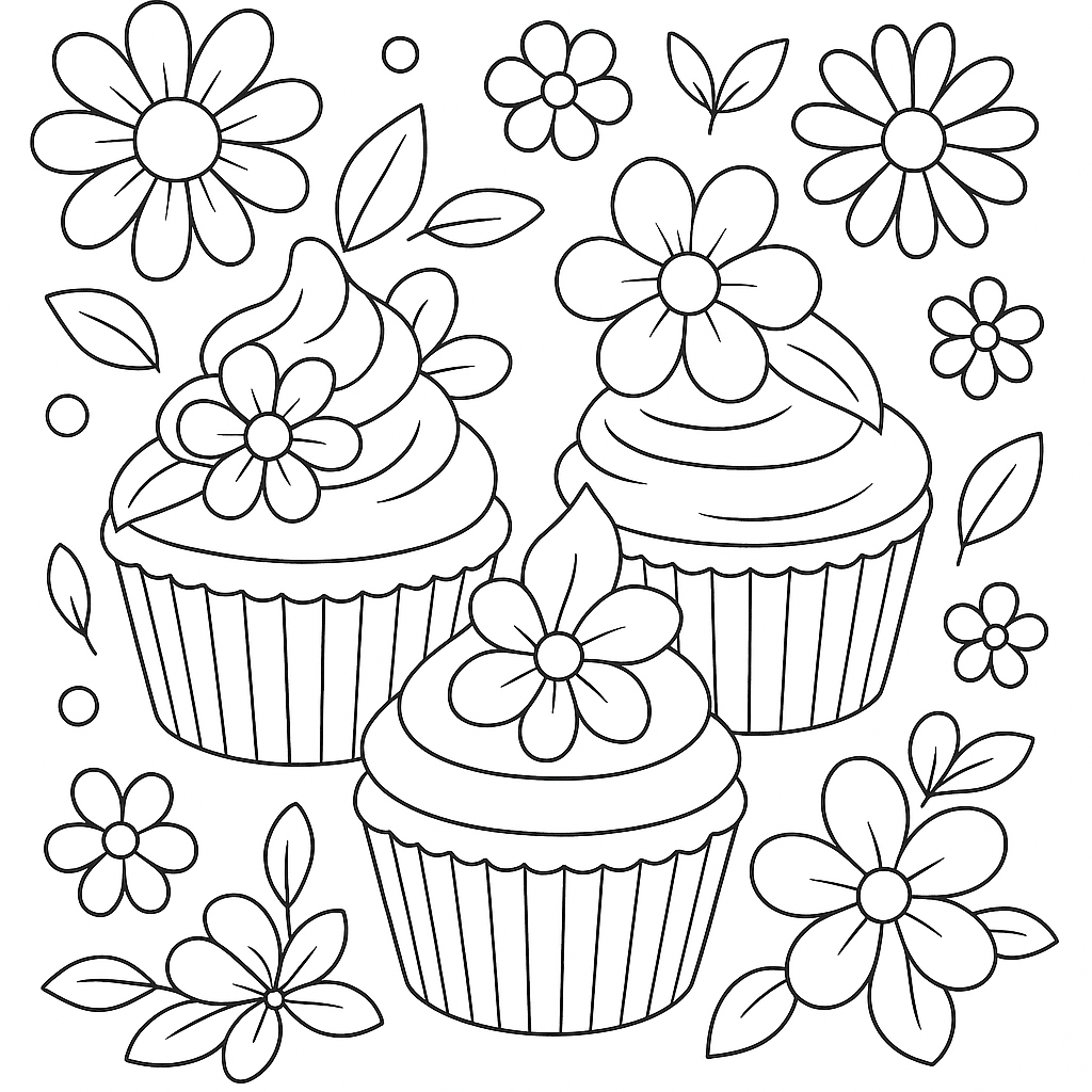 A medium coloring page featuring spring-themed cupcakes decorated with flower designs. Perfect for kids (6-9) with moderately detailed outlines for a fun coloring experience.