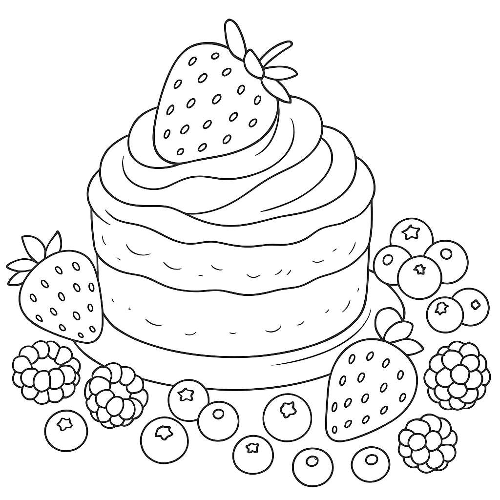 A medium coloring page featuring strawberry shortcake with fresh spring berries. Perfect for kids (6-9) with moderately detailed outlines for a fun coloring experience.