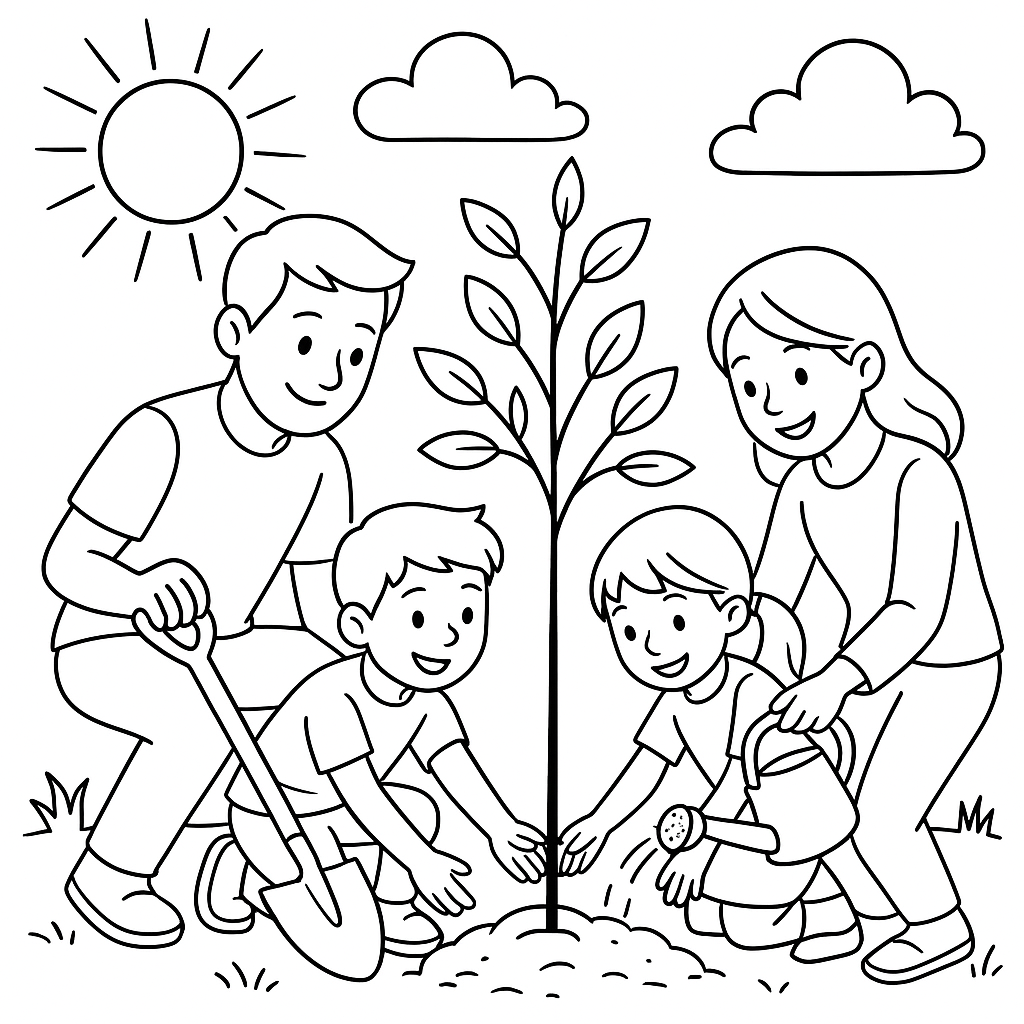 A medium coloring page featuring a family planting a new tree together. Perfect for kids (6-9) with moderately detailed outlines for a fun coloring experience.