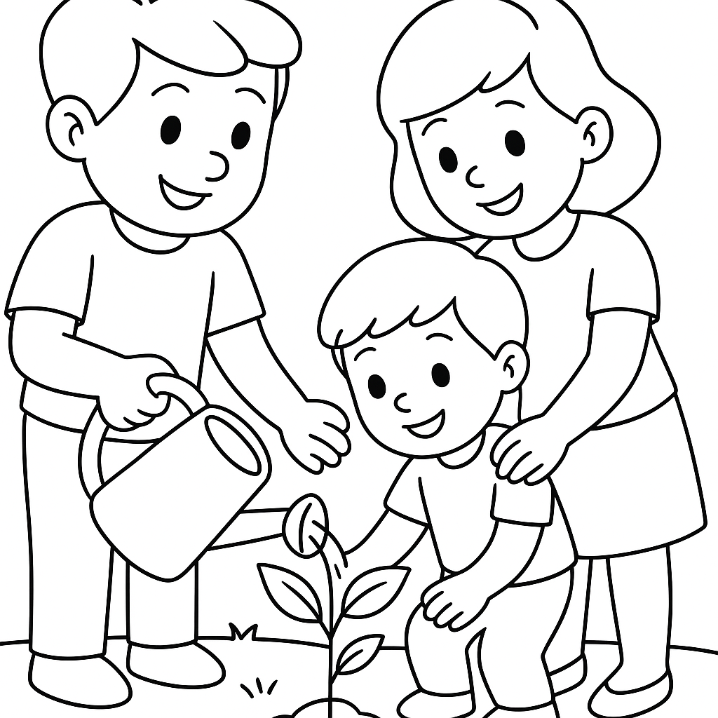 A simple coloring page featuring a family watering a newly planted sapling. Perfect for kids (4-6) with large, bold outlines for a fun coloring experience.
