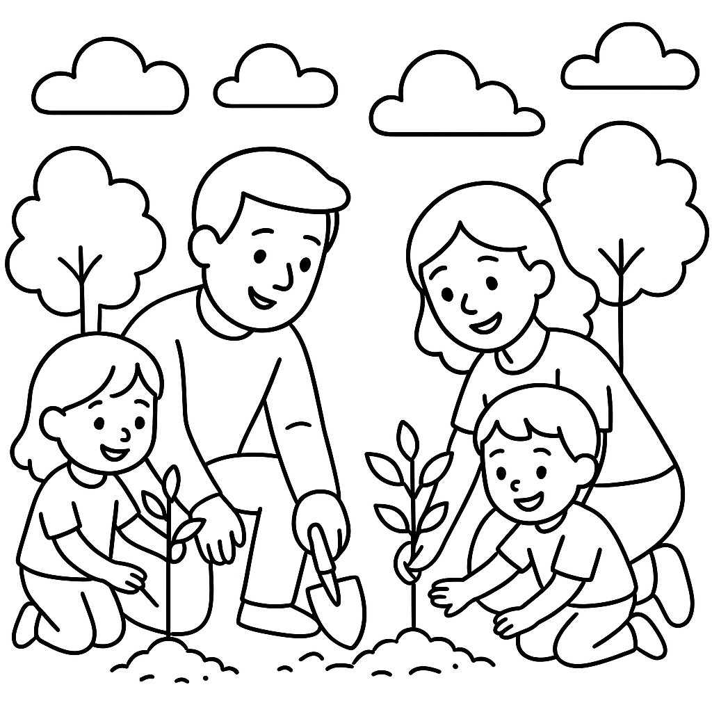 A simple coloring page featuring family planting a young oak tree with shovels and watering can. Perfect for kids (4-6) with large, bold outlines for a fun coloring experience.