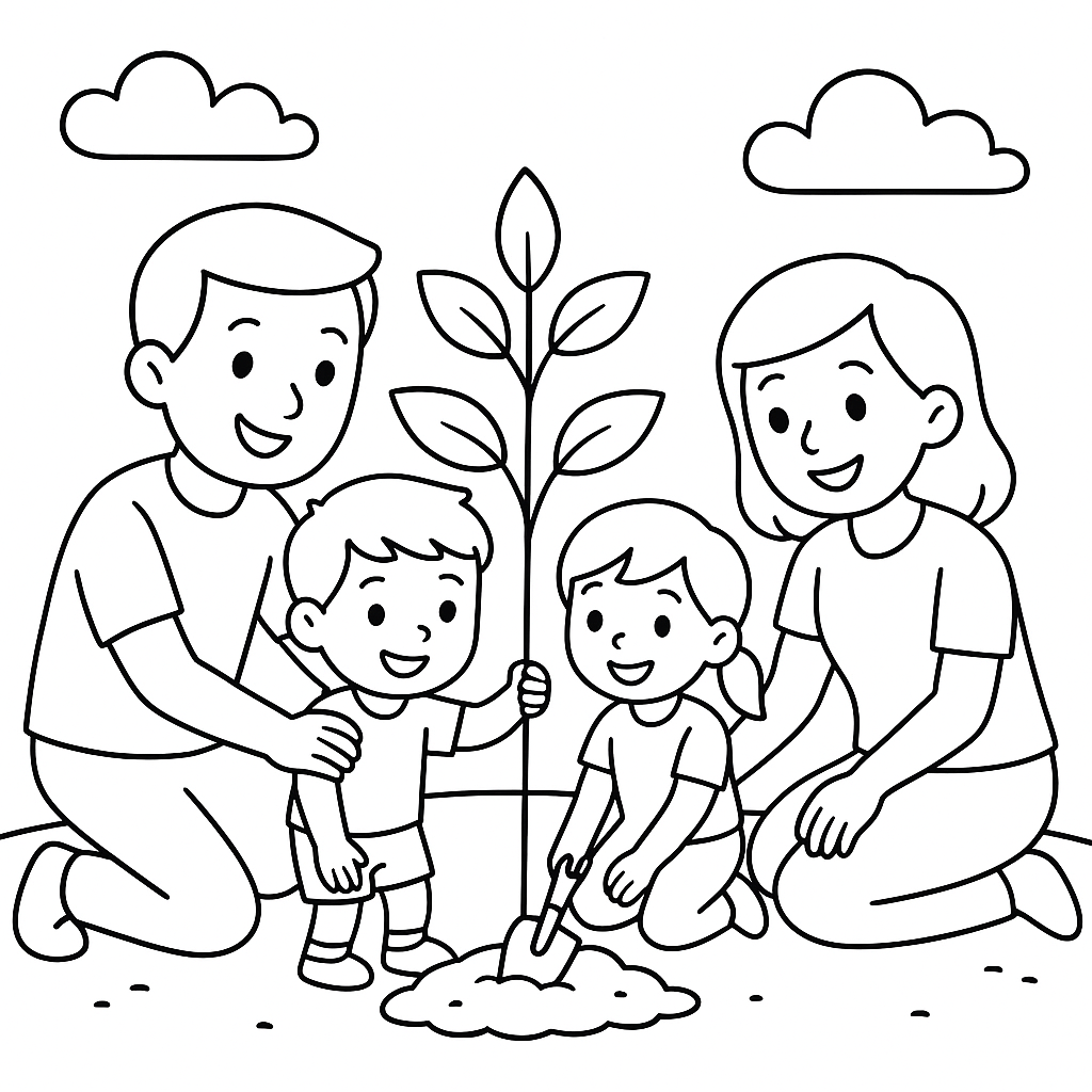 A simple coloring page featuring family planting a young tree together. Perfect for kids (4-6) with large, bold outlines for a fun coloring experience.